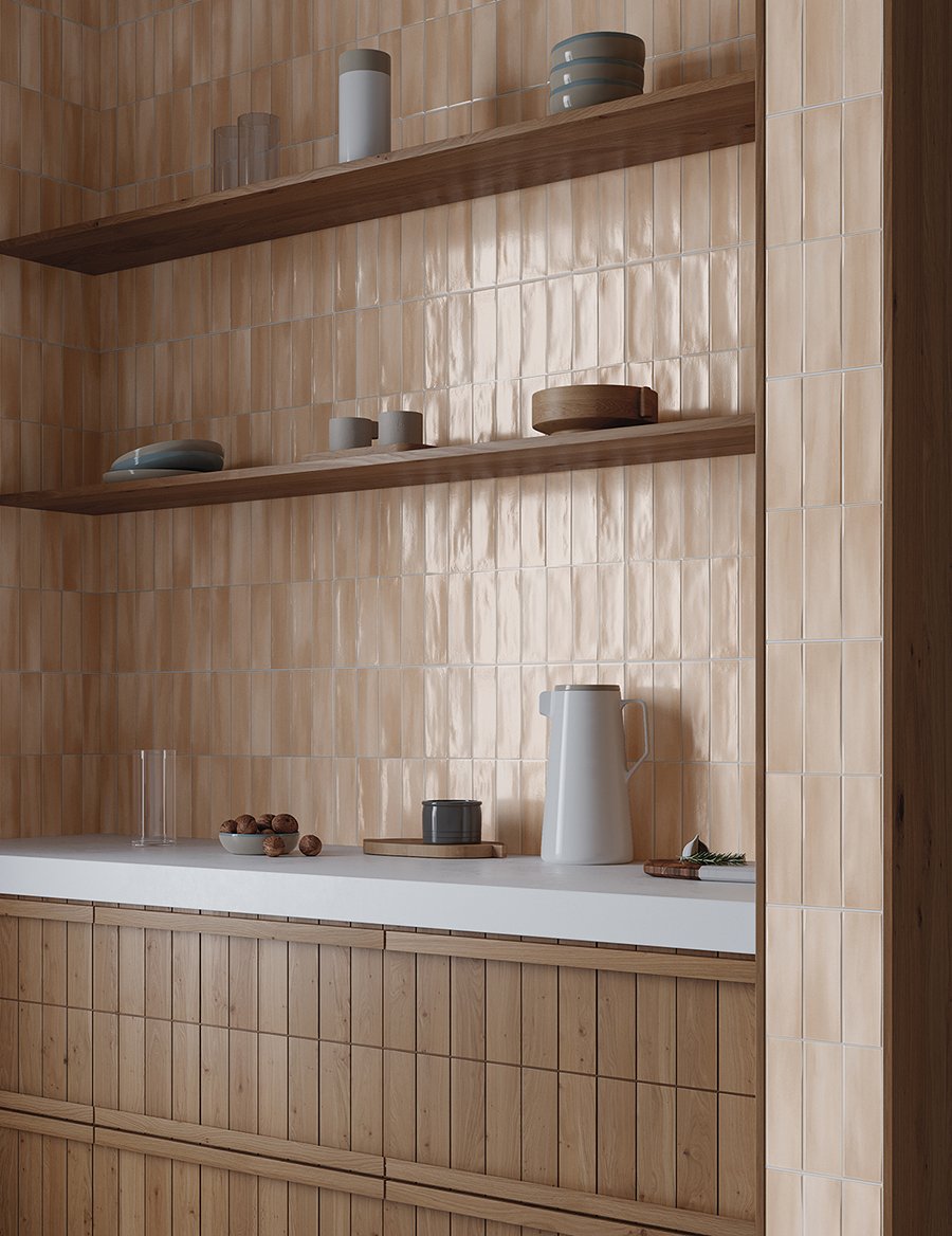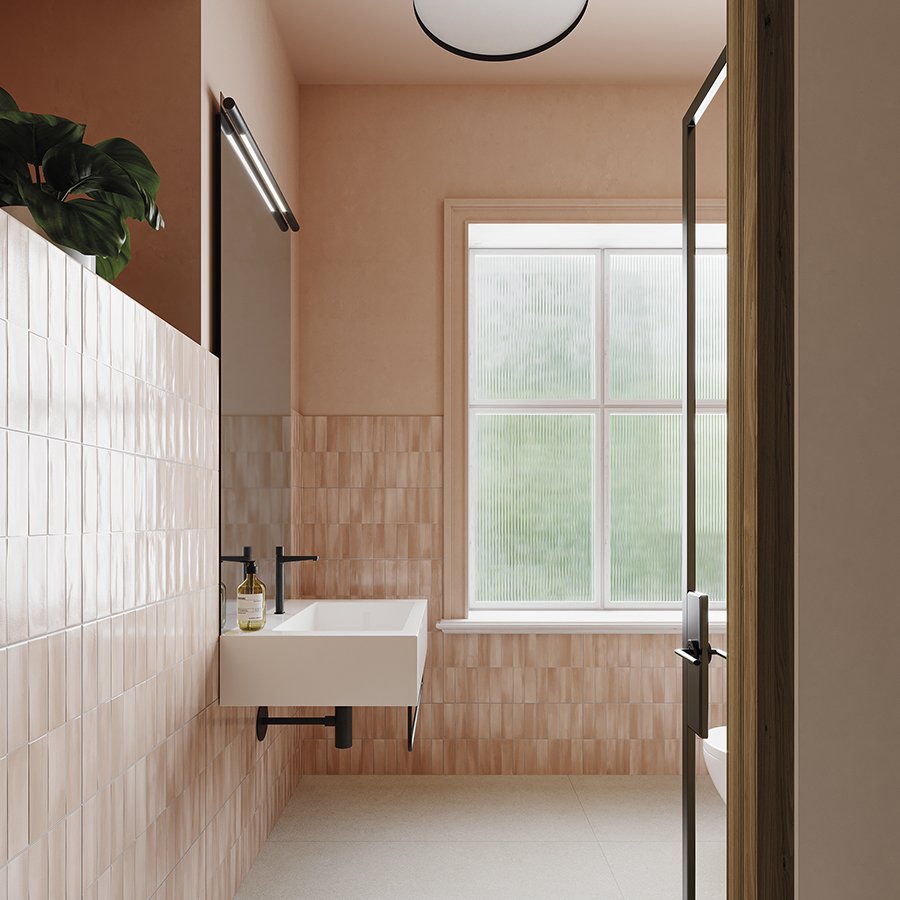 Inspired by handcrafted glazed ceramic tiles and Western Islamic architecture, Deco Allure marks the revival of monochrome tiles. Its glossy surface and fluid, watercolor-like tonal variations create an imperfect beauty, making each tile a unique, one-of-a-kind piece. Deco Allure Rose is a soft blush-pink tone with subtle red undertones, reminiscent of Mediterranean seaside houses, bringing a charming and distinctive character to the space.