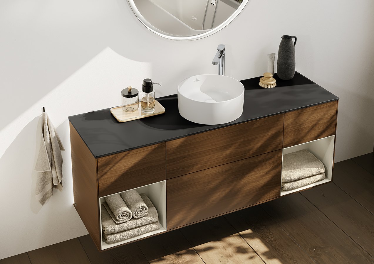 Lavabo đặt bàn Collaro hình tròn, chất liệu TitanCeram bền bỉ, mang đến điểm nhấn sang trọng cho không gian. Nên lắp cách tường ít nhất 50 mm và có thể kết hợp linh hoạt với vòi đặt bàn hoặc vòi treo tường.