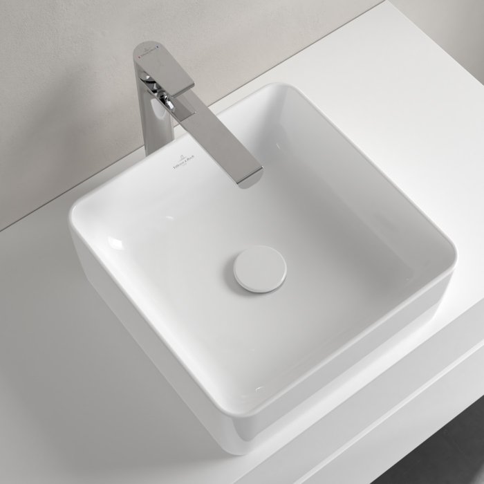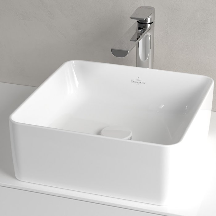 Lavabo đặt bàn Collaro hình vuông, chất liệu TitanCeram bền bỉ, mang đến điểm nhấn sang trọng cho không gian. Nên lắp cách tường ít nhất 50 mm và có thể kết hợp linh hoạt với vòi đặt bàn hoặc vòi treo tường.