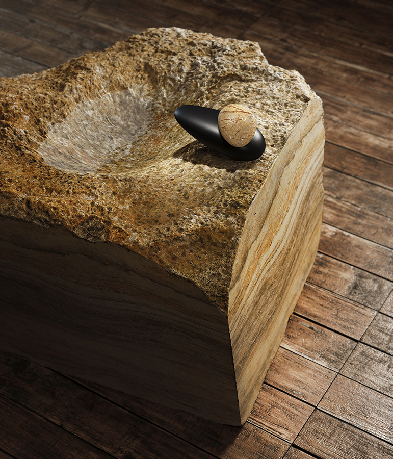 Lấy cảm hứng từ nghệ thuật cân bằng đá, bộ sưu tập Equilibrio thể hiện mối liên kết sâu sắc với nước và năng lượng tạo ra khi những viên đá đạt đến trạng thái cân bằng. Nhà sáng tạo Marsel Lesko cùng nhà thiết kế Giuseppe Maurizio Scutella đã chuyển hóa ý niệm này thành hình thái sản phẩm mang tính biểu tượng – hai viên đá công thái học chồng lên nhau một cách tinh tế.