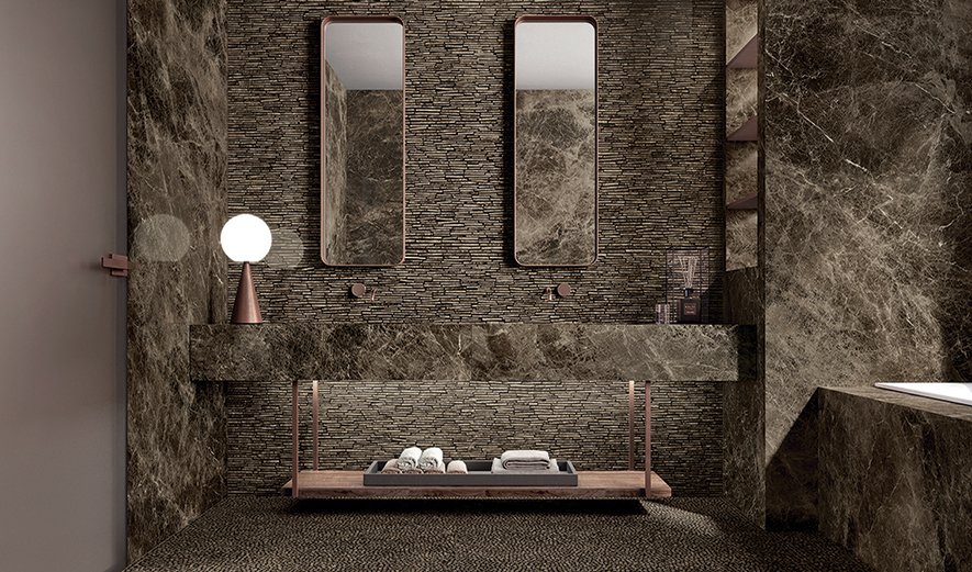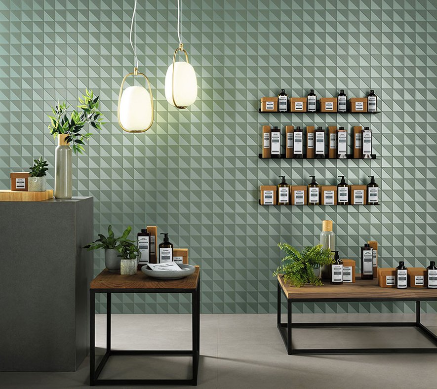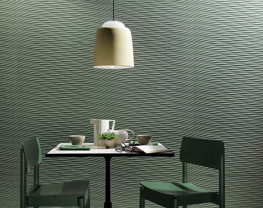 Màu xanh lá cây sâu được lấy cảm hứng từ thiên nhiên sẽ mang đến trải nghiệm đầy tinh tế vào nhà. Ở đây, lựa chọn thiết kế bức tường 3DwallDesign hay gạch khổ lớn Domestic Jungle sẽ đem đến không gian phòng màu xanh mát dịu và tươi mới