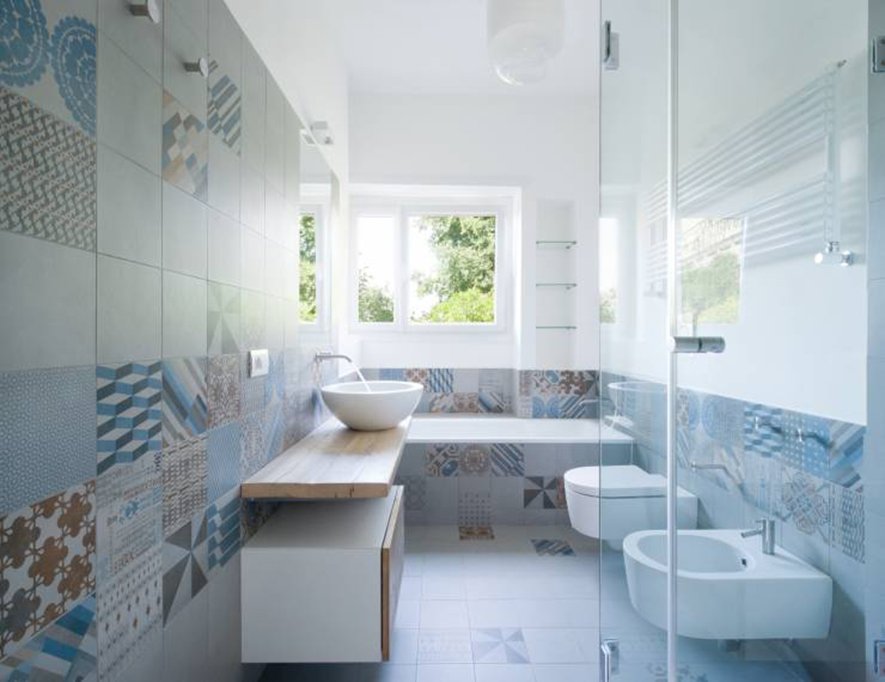 Khi xem xét các giải pháp gạch ốp lát cho một phòng tắm tinh tế và hiện đại, gia chủ nên tuân theo nguyên tắc “Ít là nhiều”. Vì thế, bạn nên phối hợp gạch bông ốp tường, lát sàn với gạch vân đá tự nhiên trong phòng tắm. Sự kết hợp ngẫu nhiên này đem đến thiết kế phòng tắm đẹp khác biệt và thu hút.