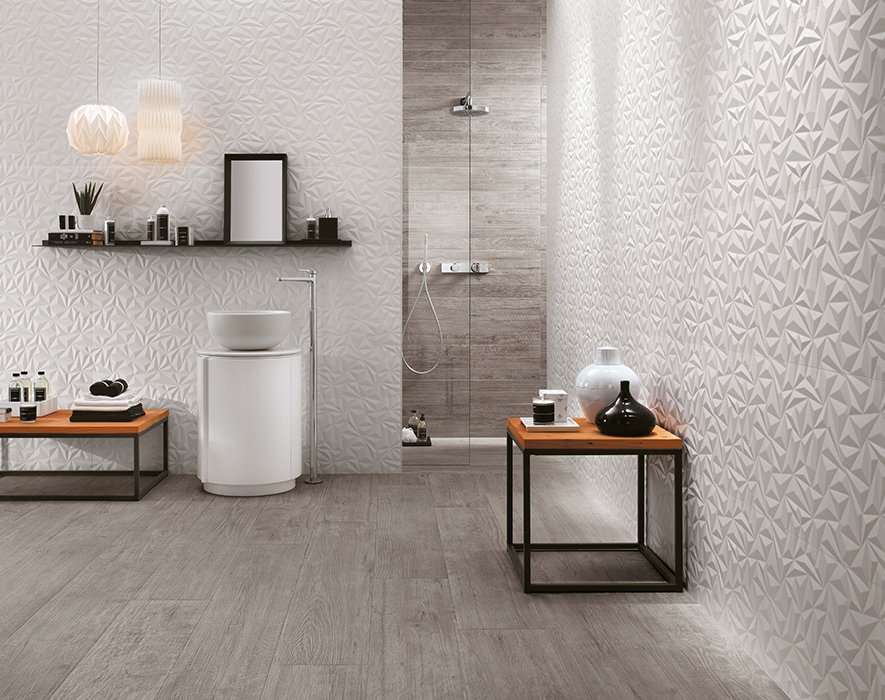 Ứng dụng ốp lát gạch 3D đang trở thành xu hướng nổi bật trong các thiết kế phòng tắm. Gạch 3 chiều đem đến những ấn tượng họa tiết hình học đa diện cho không gian hiện đại. Với đường nét tinh tế và tông màu trung tính của gạch, phòng tắm được trang hoàng theo phong cách thời thượng và tươi mới.