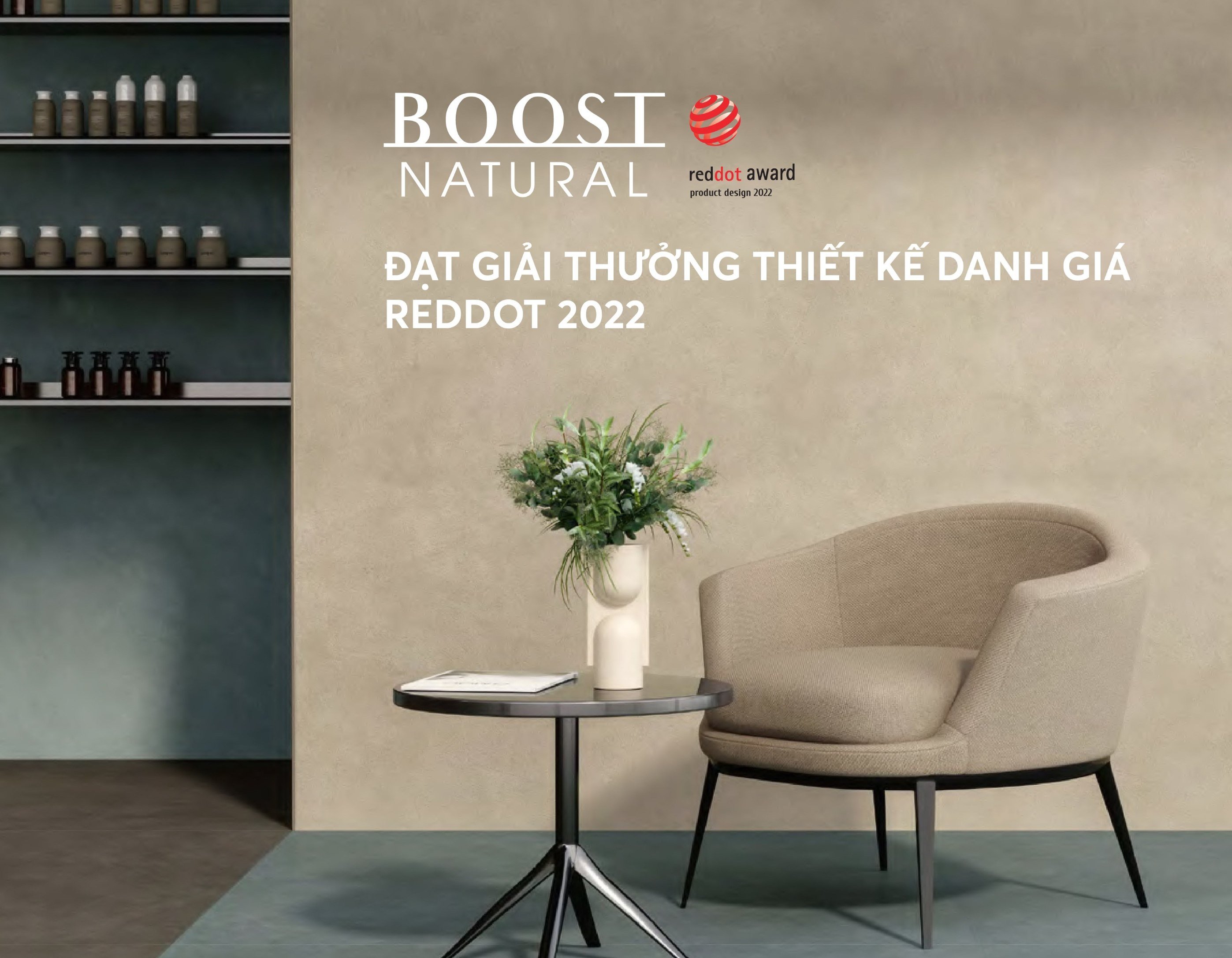Giải thưởng Thiết kế Red Dot 2022 đã vinh danh Boost Natural với lời ngợi khen: BST gạch này truyền cảm hứng cho những ai chạm vào nó, nhìn thấy nó bởi sự tinh tế, khéo léo, độc đáo từ bề mặt cho tới màu sắc.