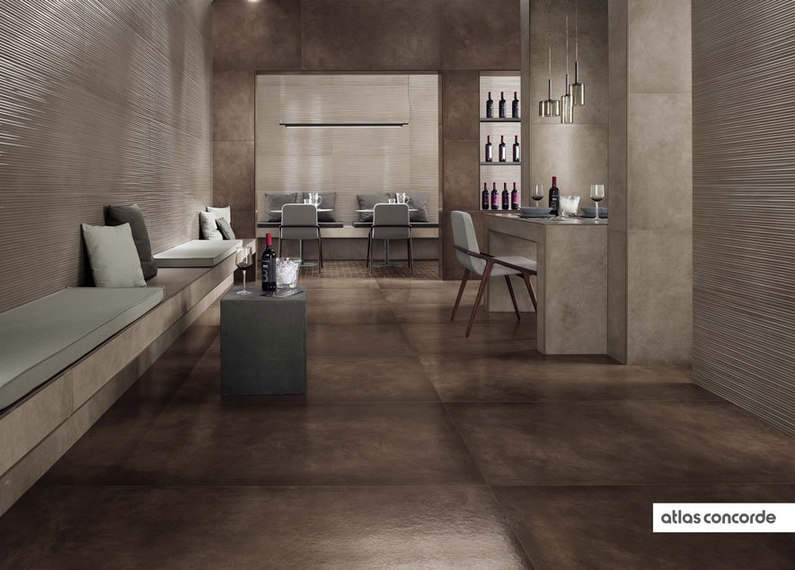 Các hiệu ứng và đường nét của lớp đá trầm tích đem đến màu sắc thanh lịch và hiện đại cho không gian nhà hàng.