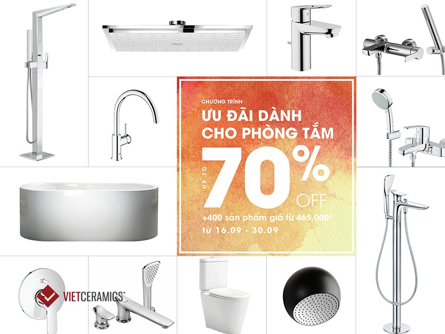 Chỉ trong 2 tuần duy nhất từ 16/9/2017 đến 30/9/2017, Vietceramics giới thiệu chương trình ưu đãi đặc biệt lên đến 70% dành cho các sản phẩm thiết bị vệ sinh, nhà tắm cao cấp từ các thương hiệu nổi tiếng như Fima (Ý), Kludi, Duravit, Grohe (Đức), Cotto (Thái Lan). Với kiểu dáng sang trọng cùng những tính năng hiện đại, các sản phẩm thiết bị vệ sinh bao gồm bồn tắm, sen tắm, vòi rửa v.v không chỉ nâng cấp không gian phòng tắm mà còn mang đến những tiện nghi tối ưu trong sử dụng, theo phong cách thiết kế nội thất của bạn.