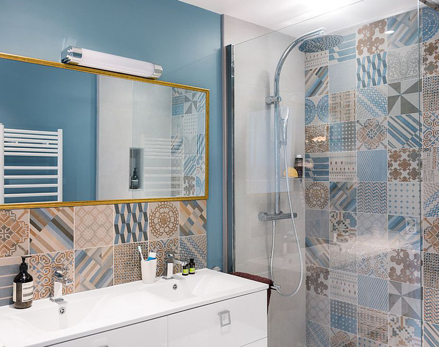 Đối với người yêu mến xu hướng này nhưng lại phân vân về cách ứng dụng sao cho phù hợp với toàn không gian mà không bị lạc lõng, ý tưởng thay đổi từng góc nhỏ trong một không gian lớn là phương án thích hợp nhất ví dụ như ốp gạch bông cho khu sen tắm trở nên khác biệt là một ý tưởng hay. Các góc hẹp được tận dụng làm không gian lưu trữ ứng dụng gạch bông hoa văn tạo một cái nhìn nổi bật cho không gian phòng tắm của bạn.