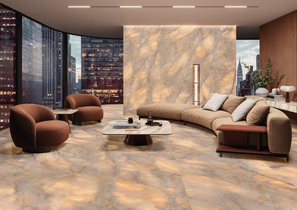 Hiệu ứng thị giác của Tele di Marmo Lumia Golden Ambra làm vật liệu như phát sáng từ bên trong, tái hiện sinh động vẻ lộng lẫy của các mảng màu be ấm áp với các đường vân xám tương phản. Sự tương tác của ánh sáng làm nổi bật các sắc thái vàng phong phú và tạo ra hiệu ứng mờ ảo độc đáo, quyến rũ, tái hiện dấu ấn tự nhiên của tinh thể đá quý, cũng như thể hiện vẻ đẹp chân thực và chiều sâu của đá Hổ Phách.
