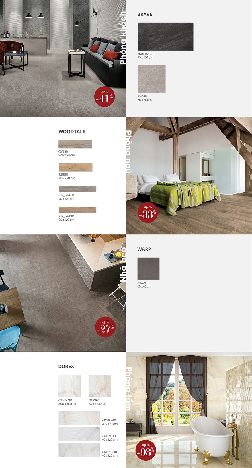 Vietceramics giới thiệu chương trình ưu đãi lên đến 75% gạch ốp lát nhập khẩu từ các thương hiệu hàng đầu thế giới (Atlas Concorde, Emil, Mirage, Marazzi, …) từ 15.03.2019 đến 31.05.2019 với hơn 100 bộ sưu tập gạch lát nền và ốp tường ấn tượng. Các thiết kế bề mặt từ gạch vân đá marble, gạch vân đá tự nhiên, gạch thiết kế xi măng đến gạch trang trí, gạch vân gỗ đa dạng về màu sắc và kích thước hứa hẹn sẽ mang đến nhiều lựa chọn cho các thiết kế ngoại, nội thất cho mọi không gian nhà ở và công trình thương mại.