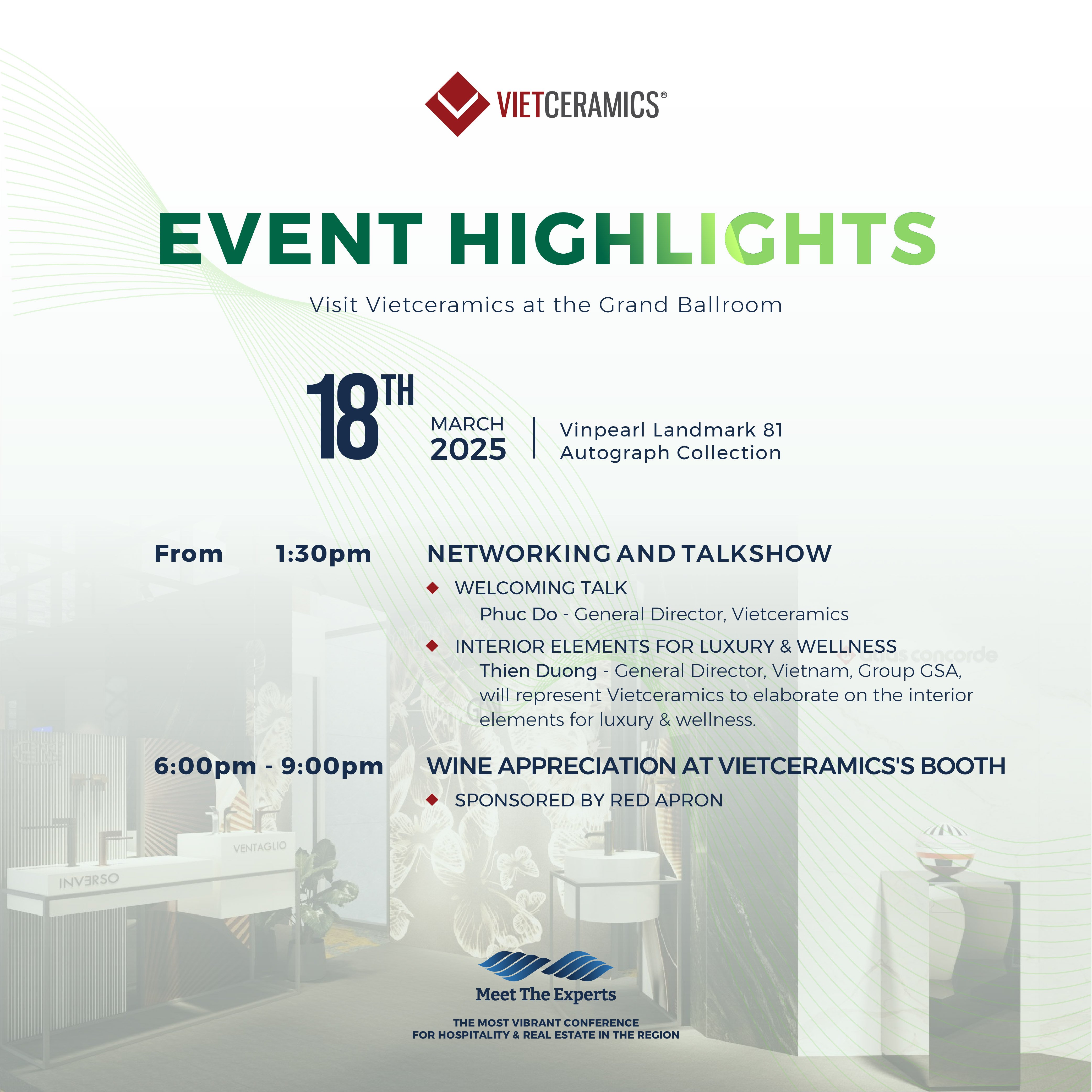 Meet The Experts 2025 do Vietceramics đồng tổ chức quy tụ 50 chuyên gia hàng đầu và 30 đối tác danh tiếng nhất thị trường. Sự kiện không chỉ là diễn đàn giữa các chuyên gia đầu ngành, mà còn là nơi các chủ đầu tư chia sẻ tầm nhìn và mở rộng hợp tác với các đơn vị dẫn đầu thị trường.