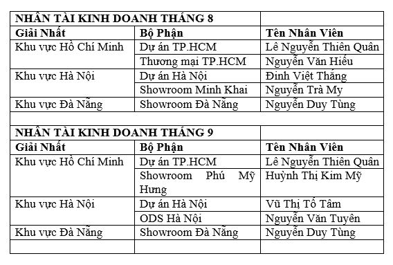 Bên cạnh đó, chị Nguyễn Thị Nhường – Dự án HCM, anh Trần Phan Bình An – Thương mại HCM, anh Phong Trung Nhân – Thương mại HCM, anh Đàm Huy Thọ - Dự án HN, anh Đinh Việt Thắng – Dự án HN, anh Nguyễn Đăng Thành – Thương mại HN, anh Nguyễn  Đức Hưng – Showroom ĐN cũng xuất sắc trở thành những nhân viên kinh doanh triển vọng của tháng 8/2018 và tháng 9/2018.
