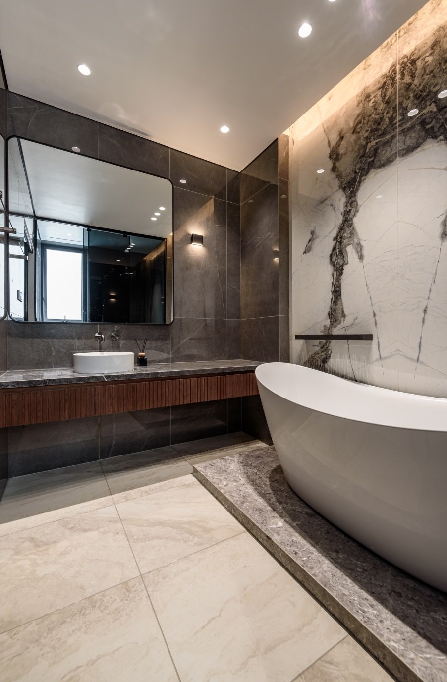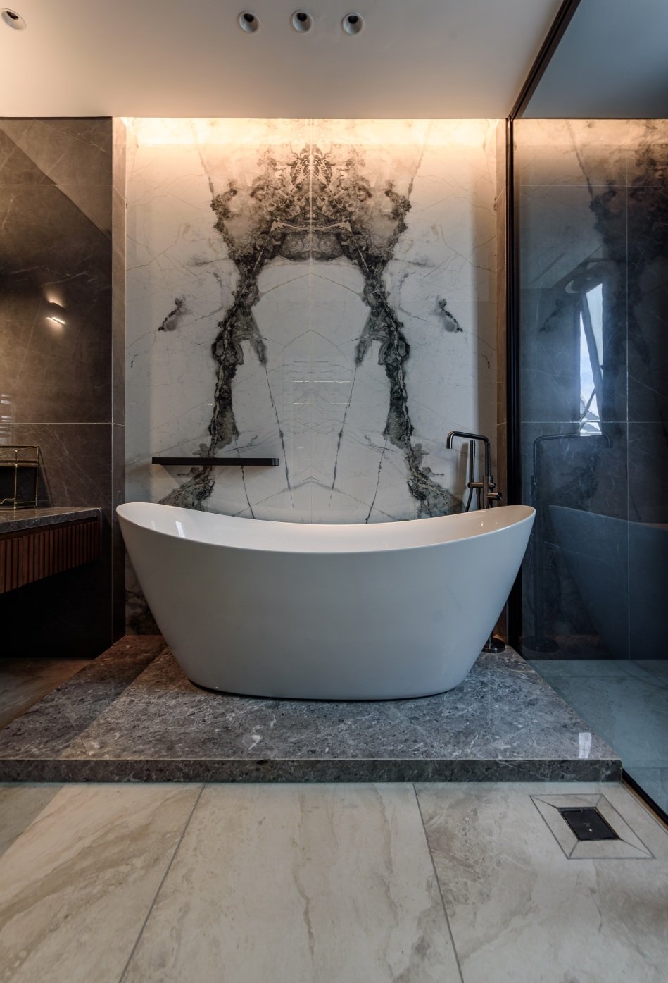 Phòng tắm được ốp tường bằng bộ sưu tập gạch marble Ý Marvel.