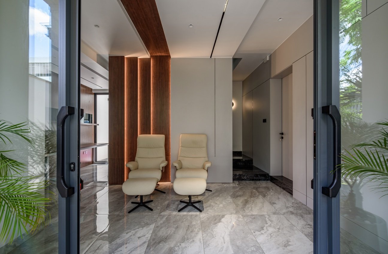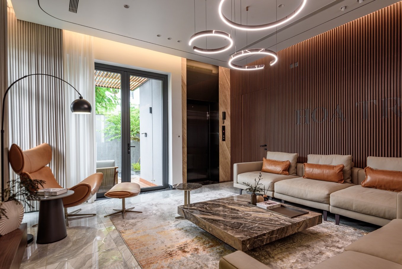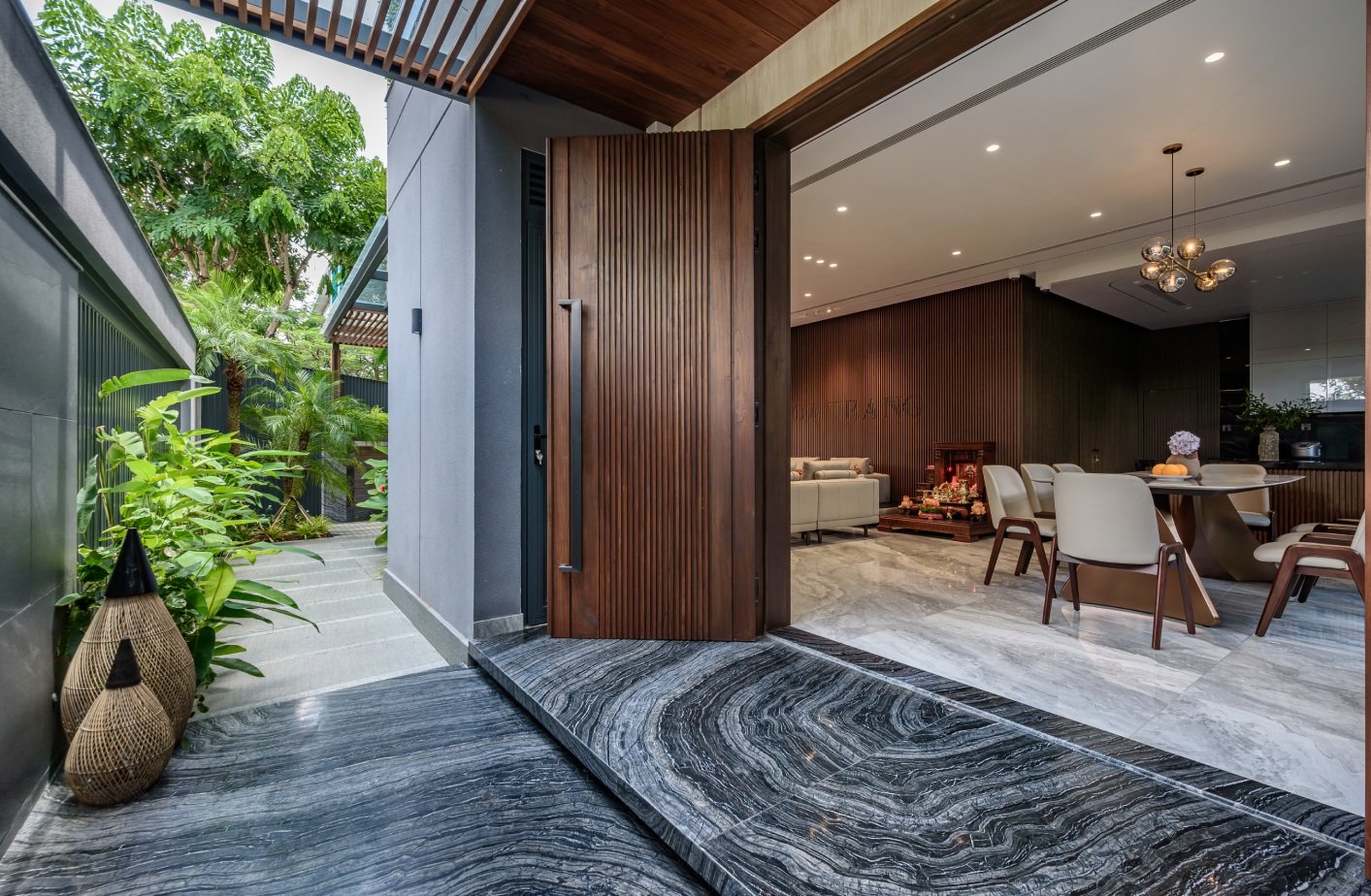Mặt tiền được ốp bằng bộ sưu tập gạch Travertino, và mẫu gạch M Stone với công nghệ kháng khuẩn được sử dụng cho các khu vực ngoài trời, đem đến sự an toàn cho sinh hoạt của gia đình.