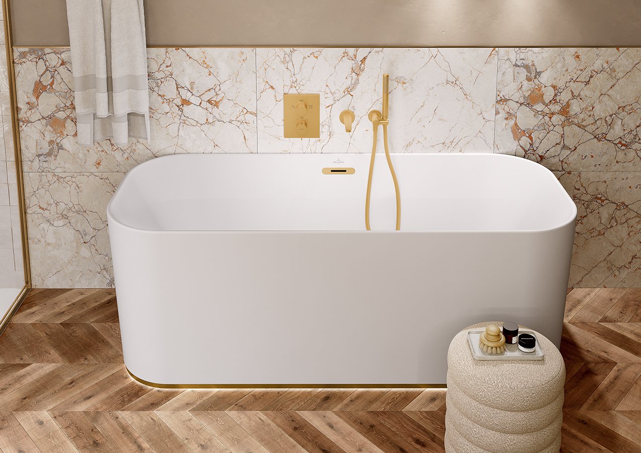Mặt nạ sen tắm gắn tường hai chức năng Villeroy & Boch Conum nổi bật với thiết kế hình học tinh xảo. Sản phẩm chế tác từ Đồng thau cao cấp, có tông màu Vàng xước. Bộ phận cấp nước sử dụng công nghệ LaminarJet tạo dòng chảy mượt, hạn chế bắn tóe. Ngoài ra, mặt nạ còn có chức năng duy trì nhiệt độ ổn định và tích hợp khóa an toàn (38 độ C).