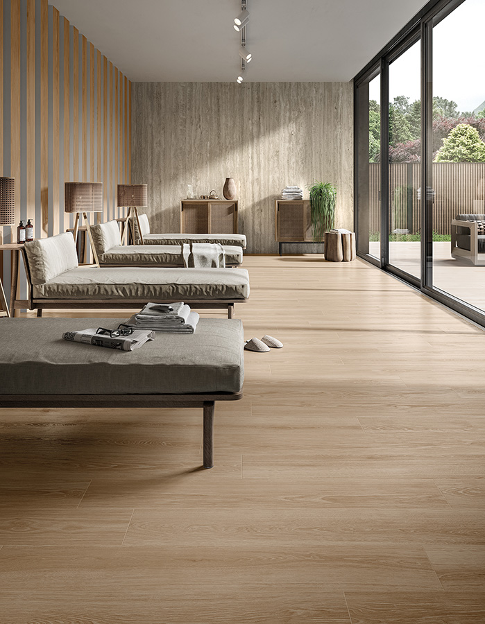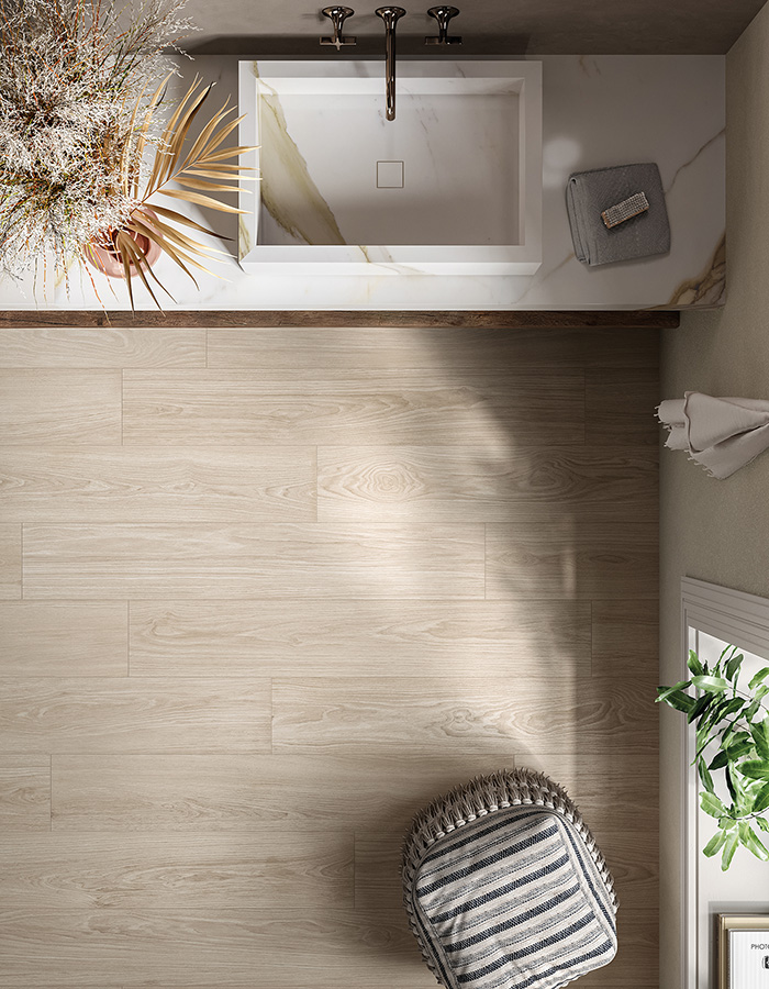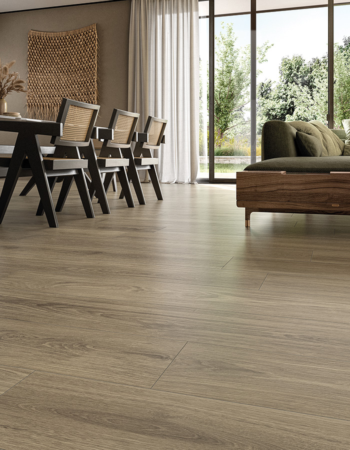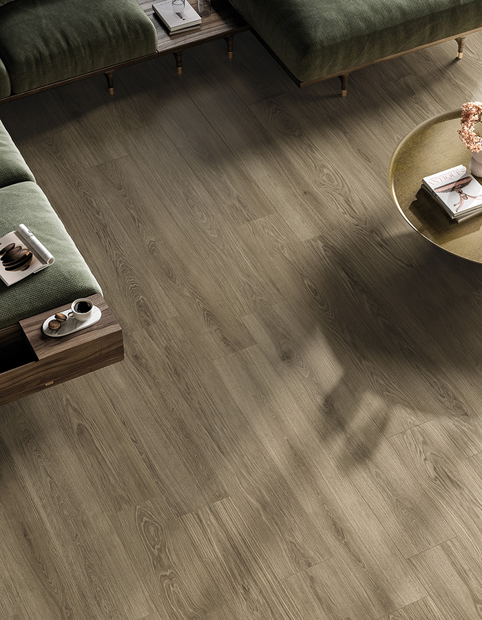 Oudh, known as Agarwood in the Arab world, has been revered as the "wood of the gods" since the dawn of civilization. This precious material serves as the inspiration for the Oudh wood-look collection, featuring soft grain patterns and knots that impart a sense of harmony to any setting.