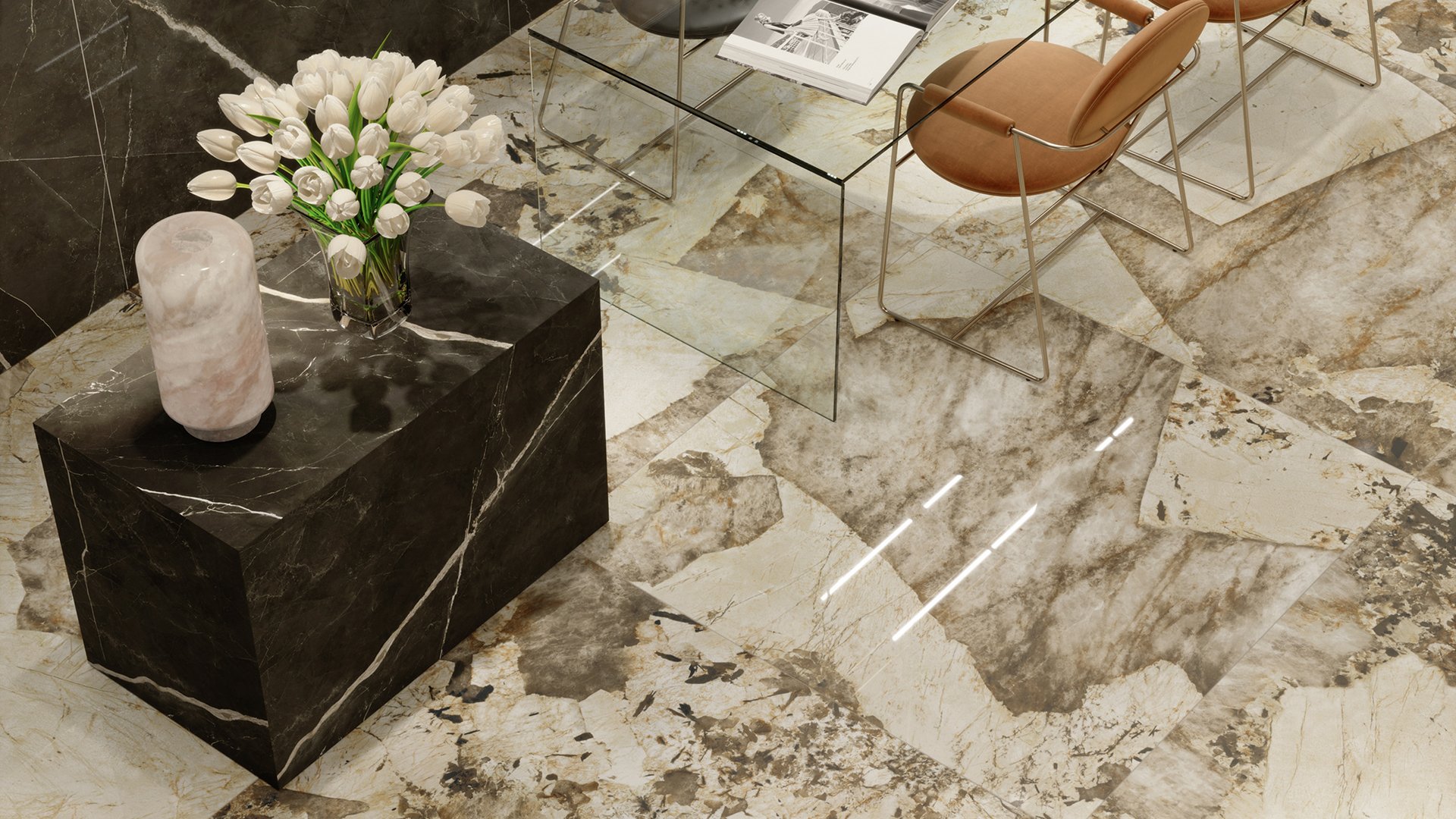 Thiết kế Desert Soul sở hữu diện mạo phá cách bởi những mảng màu nâu be và những đường vân vàng kim. Lấy cảm hứng từ Patagonia, một loại marble hình thành dưới những điều kiện khắc nghiệt ở sa mạc Nam Mỹ, vẻ đẹp phóng khoáng của Desert Soul khiến không gian sáng bừng cá tính.