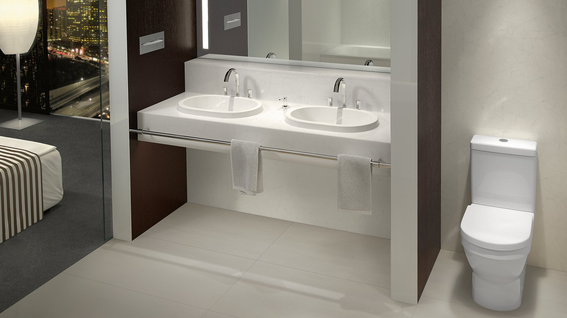 Architectura trở thành tuyên ngôn thiết kế của thời đại nhờ kiểu dáng giản lược kết hợp với các chi tiết tinh tế. Thiết kế bo góc ấn tượng, đồng bộ từ lavabo, bồn cầu và bồn tắm, giúp không gian có thêm điểm nhấn.