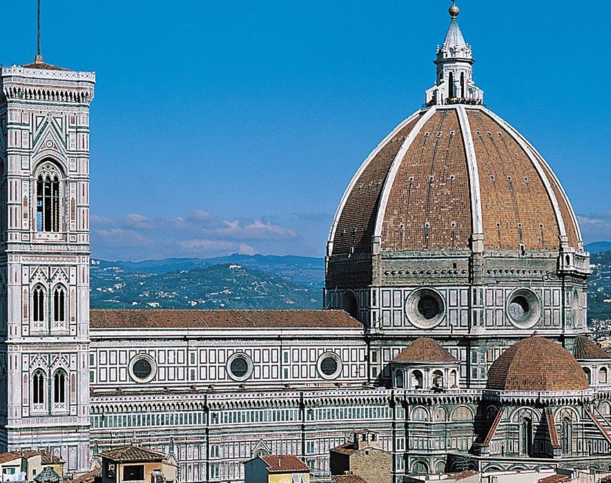 Có lẽ là địa danh đặc trưng khi đến Florence là Duomo, mái nhà màu đỏ - mái vòm gạch lớn nhất từng được xây dựng. Với sự ủng hộ của Trưởng Lão Cosimo de 'Medici, Kiến trúc sư Filippo Brunelleschi được giao nhiệm vụ xây dựng mái vòm vào năm 1420 và hoàn thành nó 16 năm sau đó. Điều kỳ diệu của công trình kiến trúc này – là nhà rửa tội và tháp chuông hoành tráng, một di sản thế giới được UNESCO công nhận.