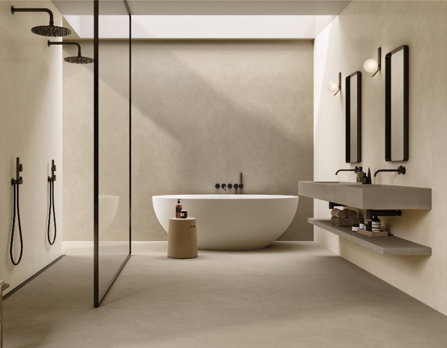 Đồng thời, không gian phòng tắm được ốp lát bởi gạch khổ lớn Boost Natural sẽ càng thêm tinh tế khi lựa chọn gạch khổ lớn cùng thiết bị vệ sinh theo phong cách tối giản.