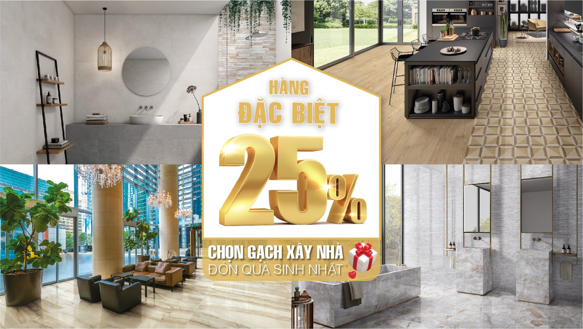 Chương trình ưu đãi 25% hàng loạt sản phẩm gạch ốp lát đến từ Ý, Tây Ban Nha, và các quốc gia hàng đầu châu Á, với mong muốn đem lại cho bạn nhiều lựa chọn chất lượng với giá đặc biệt.