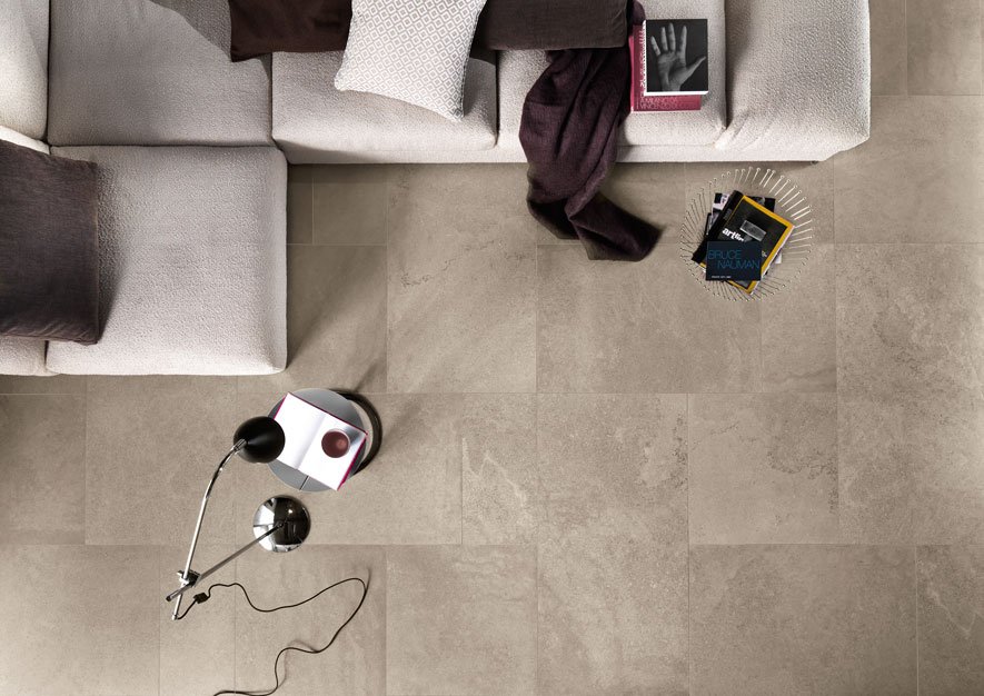 Gạch lát nền vân đá tự nhiên này làm tôn nên các màu sắc nội thất cho không gian phòng khách hiện đại này.