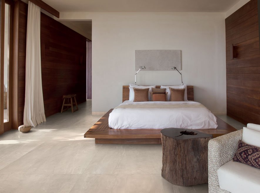 Gạch vân đá tự nhiên là một sự lựa chọn lý tưởng đem đến không gian yên bình cho căn phòng ngủ này.