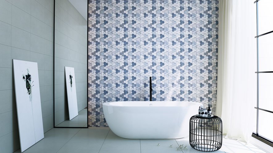 Hiệu ứng hình học 3D được mô phỏng hoàn hảo trên các bề mặt đem đến cho không gian phòng tắm những điểm nhấn hiện đại và đầy thư giãn.