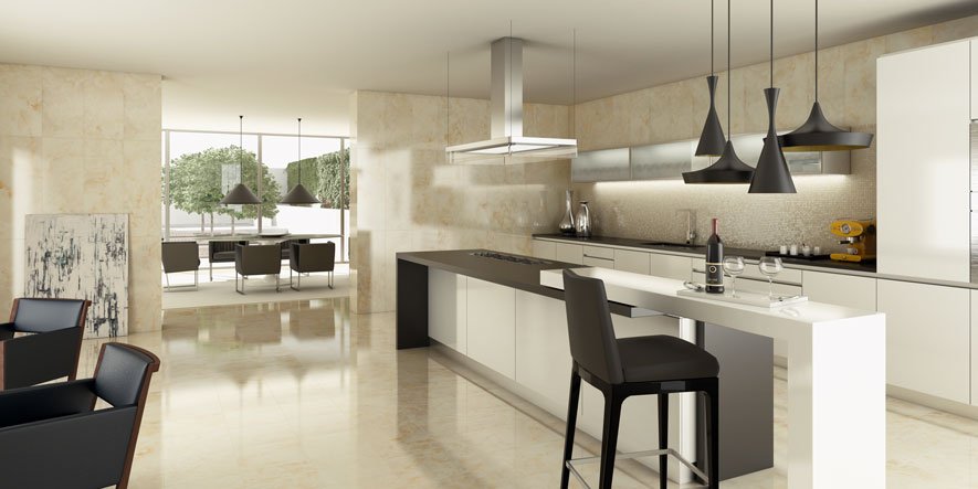 Thiết kế không gian nhà bếp hiện đại với gạch vân đá marble.