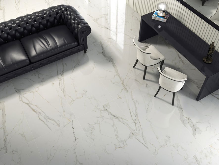 Gạch lát nền chất liệu đá marble này đem đến không gian hiện đại và sang trọng cho không gian sảnh lớn.