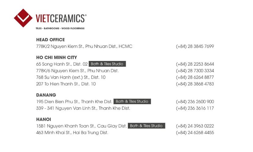 Để được tư vấn về chi tiết, vui lòng ghé thăm các showroom trên toàn quốc hoặc liên hệ hotline: 0797555299, truy cập vào website www.vietceramics.com.vn, fanpage Vietceramics https://www.facebook.com/Vietceramics/ để biết thêm chi tiết.