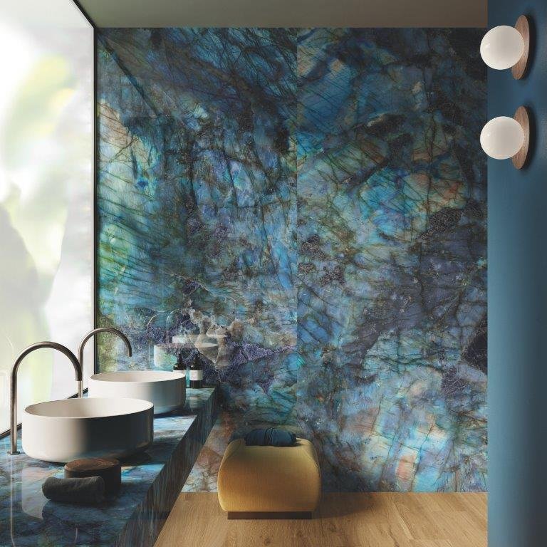 Vẻ đẹp mê hoặc của đá Xà Cừ Labradorite khi ánh sáng chiếu vào được tái hiện qua những sắc màu huyền ảo của Tele di Marmo Lumia Labradorite: Từ xanh thẳm đại dương sang xanh ngọc lục bảo quý giá, điểm xuyết ánh vàng kim sang trọng. Mỗi góc nhìn là một trải nghiệm thị giác mới đầy sống động. Chính sự thay đổi liên tục về màu sắc và ánh sáng đã làm nổi bật vẻ đẹp huyền bí, độc đáo cho không gian nội thất.