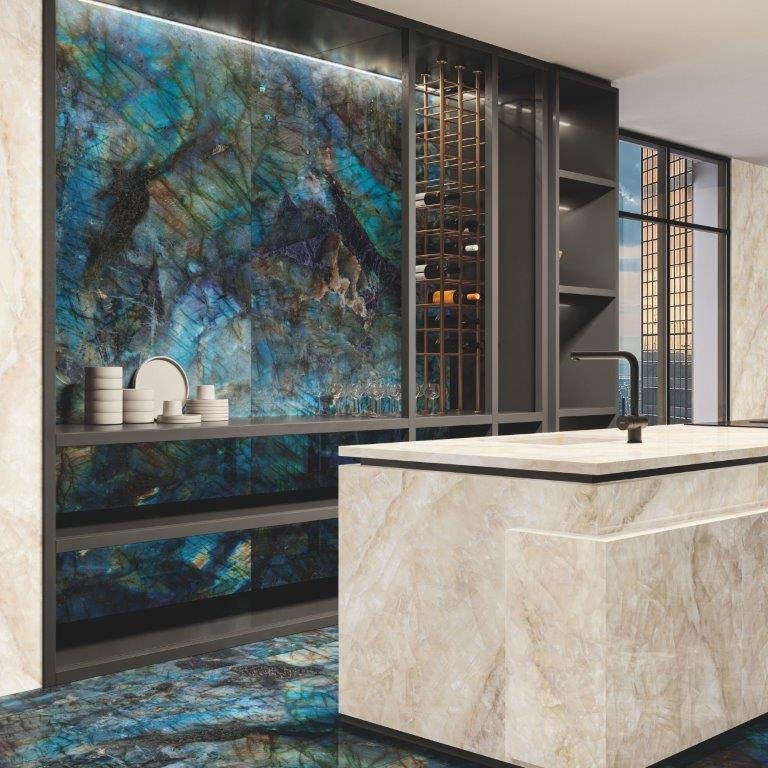 Tele di Marmo Lumia Labradorite có thể được phối cùng các mẫu gạch vân gỗ và sàn gỗ để tạo cảm giác ấm cúng và dễ chịu cho không gian.