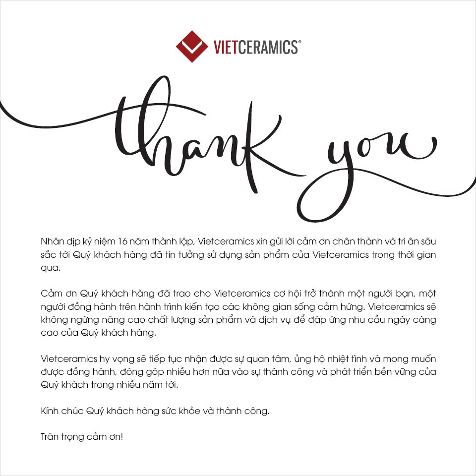Cảm ơn Quý khách hàng đã trao cho Vietceramics cơ hội trở thành một người bạn, một người đồng hành trên hành trình kiến tạo các không gian sống cảm hứng. Vietceramics sẽ không ngừng nâng cao chất lượng sản phẩm và dịch vụ để đáp ứng nhu cầu ngày càng cao của Quý khách hàng.